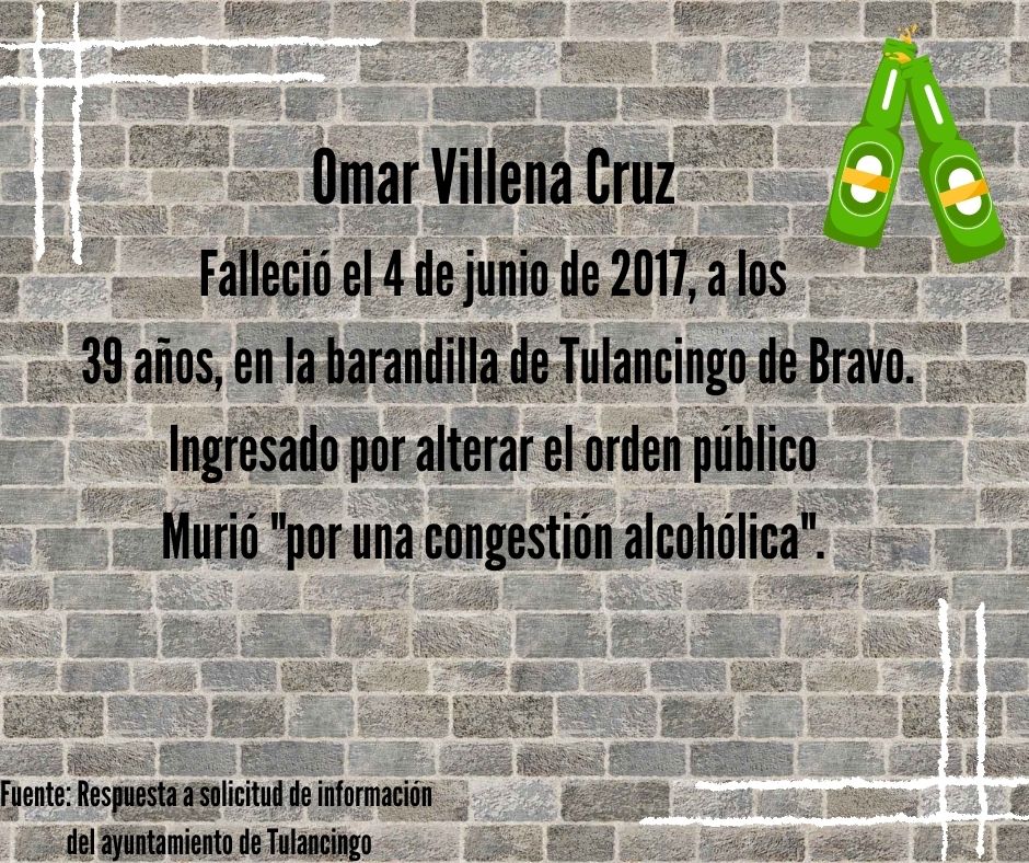 La presidencia municipal de Tulancingo, a través de su área de Transparencia, reconoce que, el 4 de junio de 2017, Omar Villena Cruz, de 39 años, también falleció en el interior de la barandilla municipal.