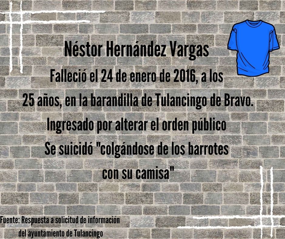 El primer caso que admite el ayuntamiento es el de Néstor Hernández Vargas, de 25 años de edad, quien el 24 de enero de 2016 falleció en la barandilla de Tulancingo tras haber sido ingresado por una falta administrativa: “Alteración del orden público”. Según el ayuntamiento, Néstor cometió suicidio “colgándose con los barrotes de la celda con su camisa”.