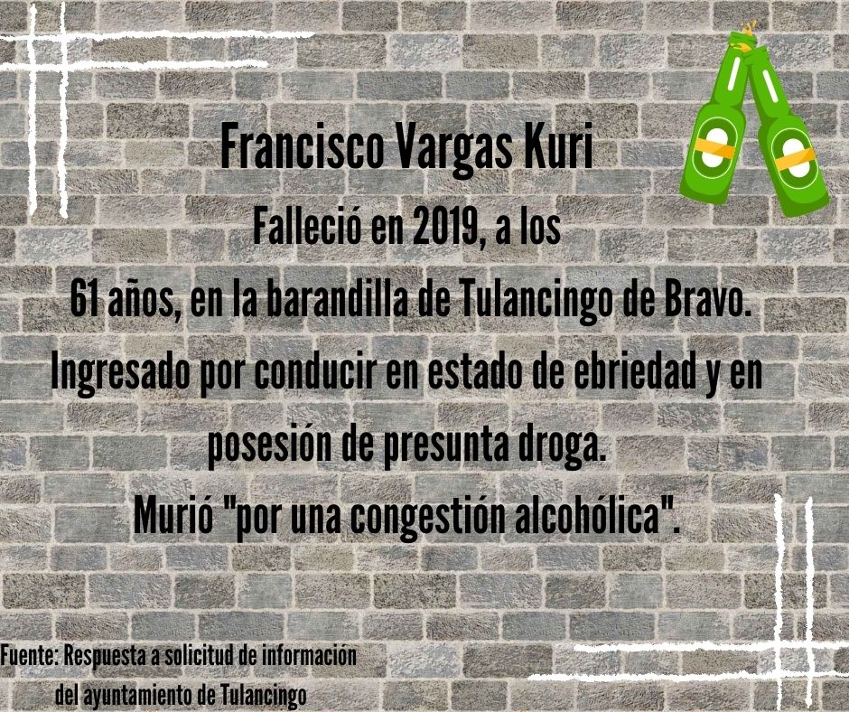 El fallecimiento más reciente registrado en la barandilla de Tulancingo corresponde a Francisco Vargas Kuri, de 61 años. Este adulto mayor fue ingresado a los separos por “conducir en estado de ebriedad y posesión de sustancia blanquecina granulada con características similares a la droga conocida como cristal en el interior de una bolsa transparente (sic)”.
