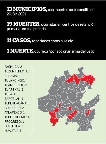 En 2021 se registraron tres muertes de personas mientras estaban en resguardo de las policías. El primer caso ocurrió el 28 de abril en el área de retención de la Policía de Investigación, en Pachuca, a donde fue remitido un hombre que presuntamente había cometido robo con violencia y fue hallado ahorcado.
