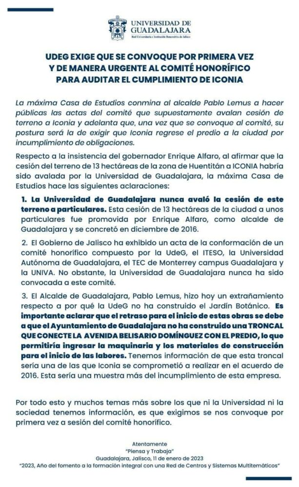 De la misma manera negó haber avalado la cesión del predio donde ahora se desarrolla Iconia como asegura el Gobierno del Jalisco y el Ayuntamiento de Guadalajara; así lo explica en este comunicado: