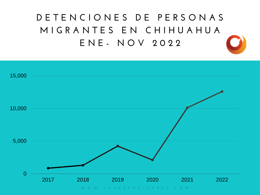 Al último corte reportado con cifras a noviembre pasado suman 12 mil 583 personas sin documentos detenidas en la entidad, principalmente en Ciudad Juárez; la cifra más alta en los últimos seis años, aunque aún falta por conocer los datos de diciembre del 2022.