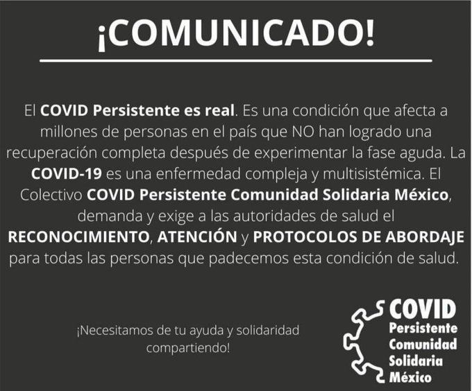 Para tener más información al respeto pueden visitar las paginas oficiales del Colectivo COVID Persistente México Comunidad en Twitter y Facebook: