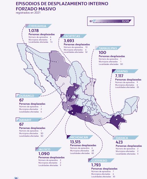 Según informaron, en 2021 se reportaron alrededor de 42 episodios de desplazamiento interno masivo causado por violencia, que equivale a 28 mil 943 personas desplazadas internas. Así mismo, durante este año, se vieron afectadas 10 unidades federativas, 57 municipios y 221 localidades, en donde Michoacán fue el estado con más personas desplazadas internas (13 mil 515)