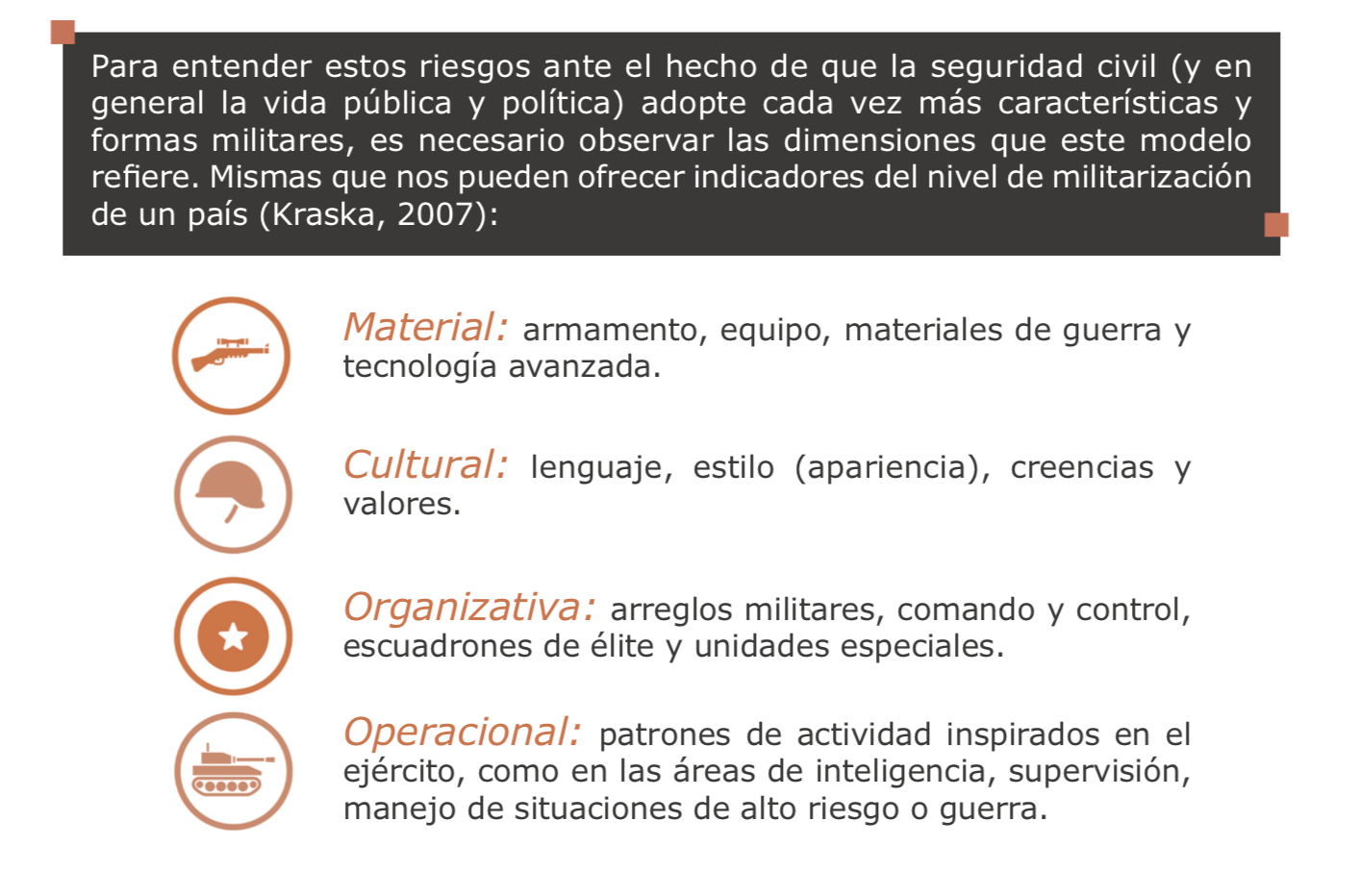 El Informe, además, brinda los indicadores para poder medir el nivel de militarización de un estado, esto conforme las nociones teóricas de Peter Kraska, quien diferencia este proceso en las dimensiones: material, cultural, organizativa y operacional.