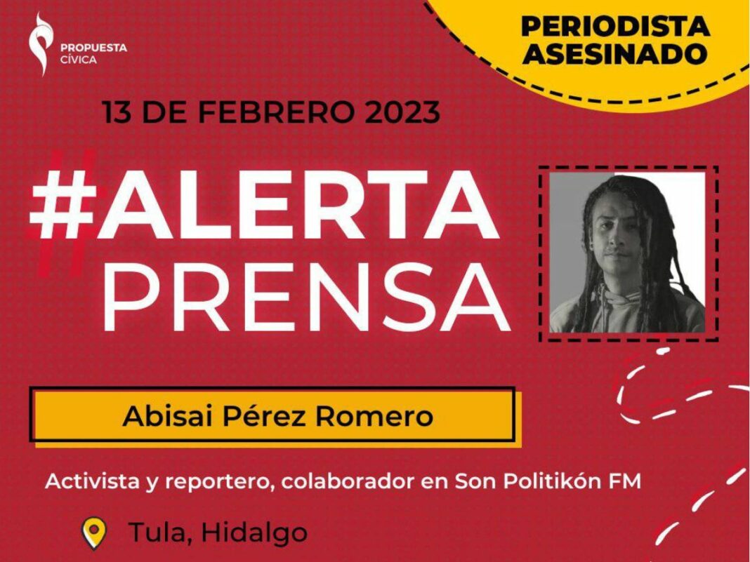 El pasado 13 de febrero, fue localizado el cuerpo sin vida del periodista Abisai Pérez Romero en el municipio de Tula de Hidalgo. Colaboraba en la elaboración de un Atlas de Justicia Ambiental para el portal Pronaii Región Tolteca de Agentes Tóxicos, en el que se denuncian los impactos al Río Tula provocados por el Túnel Emisor Oriente (TEO), así como la contaminación del proyecto Centro Regional de Tratamiento de Residuos Sólidos Urbanos (CTRSU) en Atitalaquia, Hidalgo.