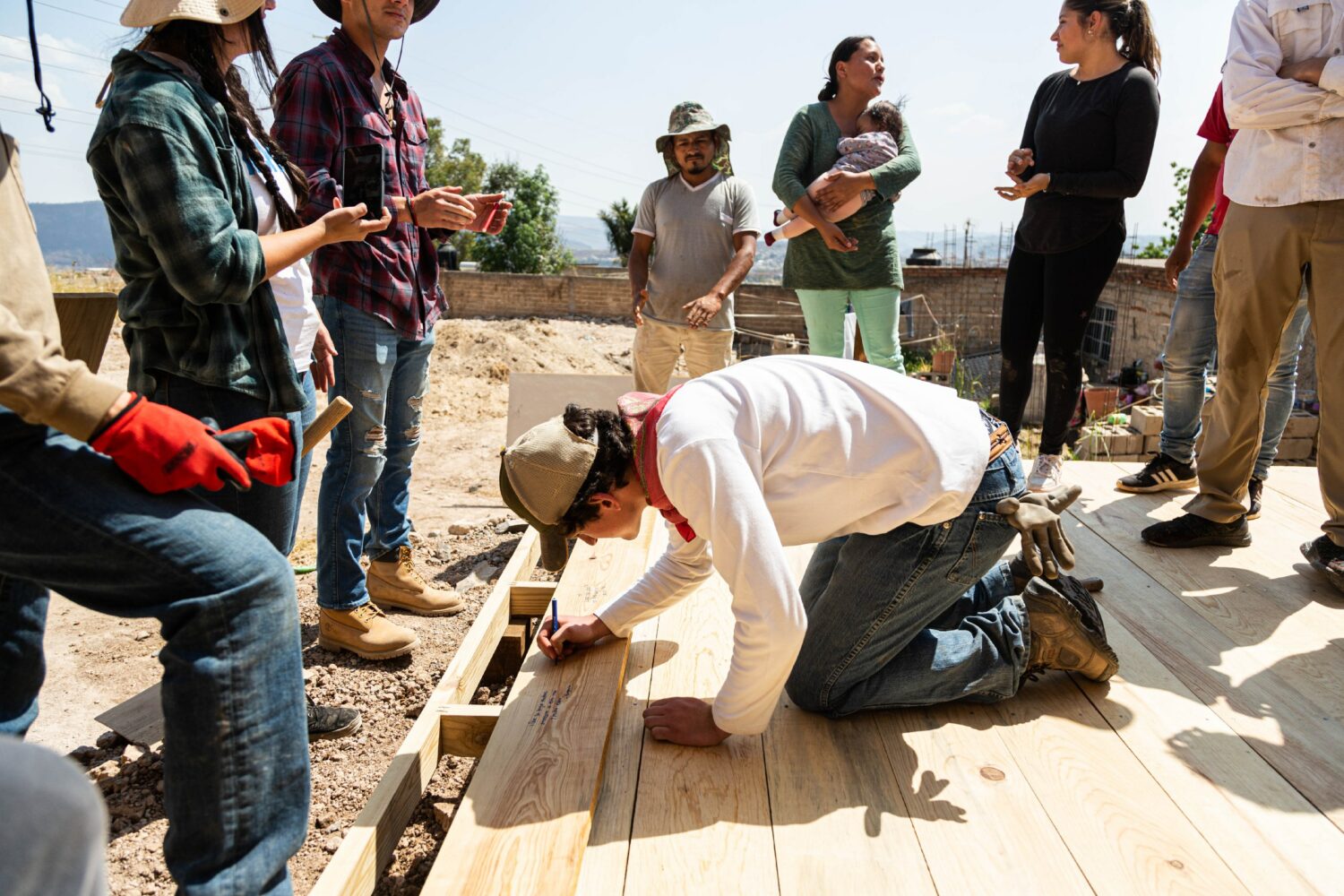 Mientras el equipo de reportería de ZonaDocs estuvo en casa de la mamá de Maritza, el equipo de voluntarios se dispuso para clavar el último tablón de la duela de la nueva vivienda de Maritza. En ese momento se llevó a cabo una ceremonia tradicional en las construcciones de la asociación civil: formaron un círculo con la familia para compartir sus buenos deseos para con ellos e inscribirlos en plumón bajo esa última tabla antes de voltearla y fijarla.