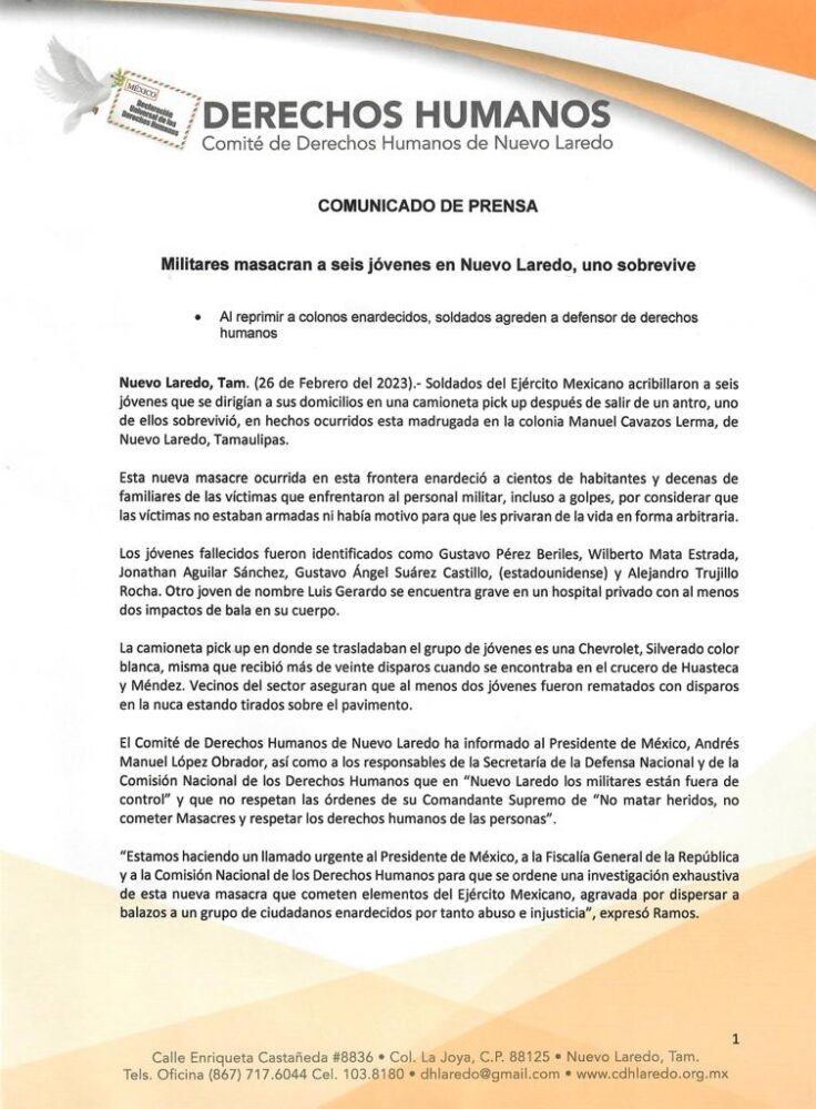 De acuerdo con el Comité de Derechos Humanos de Nuevo Laredo, en la madrugada del domingo 26 de febrero, un convoy militar disparó a una camioneta blanca marca Chevrolet que se encontraba en la calle Huasteca entre Jiménez y Méndez.