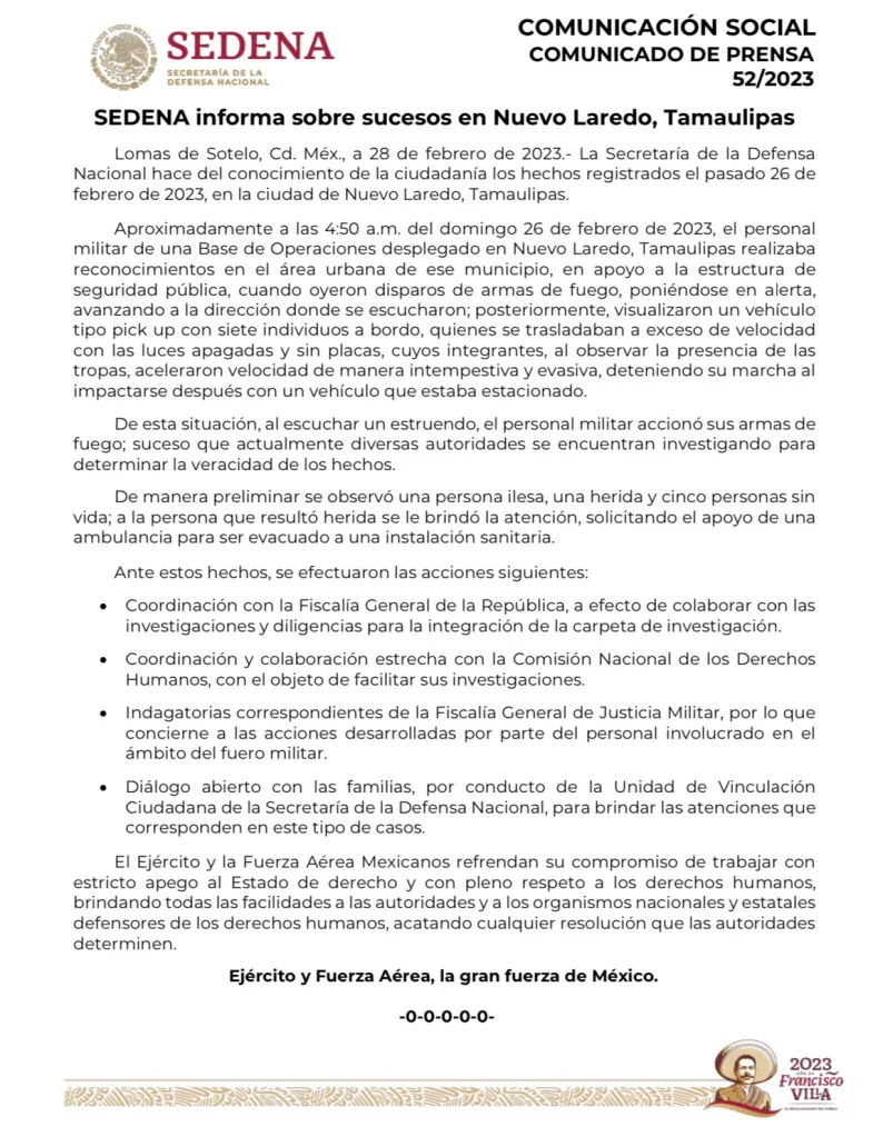 “Aproximadamente a las 4:50 a.m. del domingo 26 de febrero de 2023, el personal militar de una Base de Operaciones desplegado en Nuevo Laredo, Tamaulipas realizaba reconocimientos en el área urbana de ese municipio, en apoyo a la estructura de seguridad pública, cuando oyeron disparos de armas de fuego, poniéndose en alerta, avanzando a la dirección donde se escucharon; posteriormente, visualizaron un vehículo tipo pick up con siete individuos a bordo, quienes se trasladaban a exceso de velocidad con las luces apagadas y sin placas, cuyos integrantes, al observar la presencia de las tropas, aceleraron velocidad de manera intempestiva y evasiva, deteniendo su marcha al impactarse después con un vehículo que estaba estacionado.