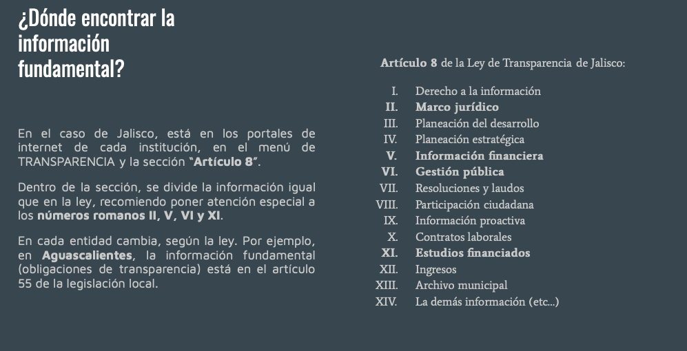 Y dicha información se puede encontrar en los portales de internet de cada institución, por ejemplo, en el menú de “TRANSPARENCIA” y la sección “Artículo x”. En Jalisco es el artículo 8, pero en cada entidad cambia el artículo, según la ley.