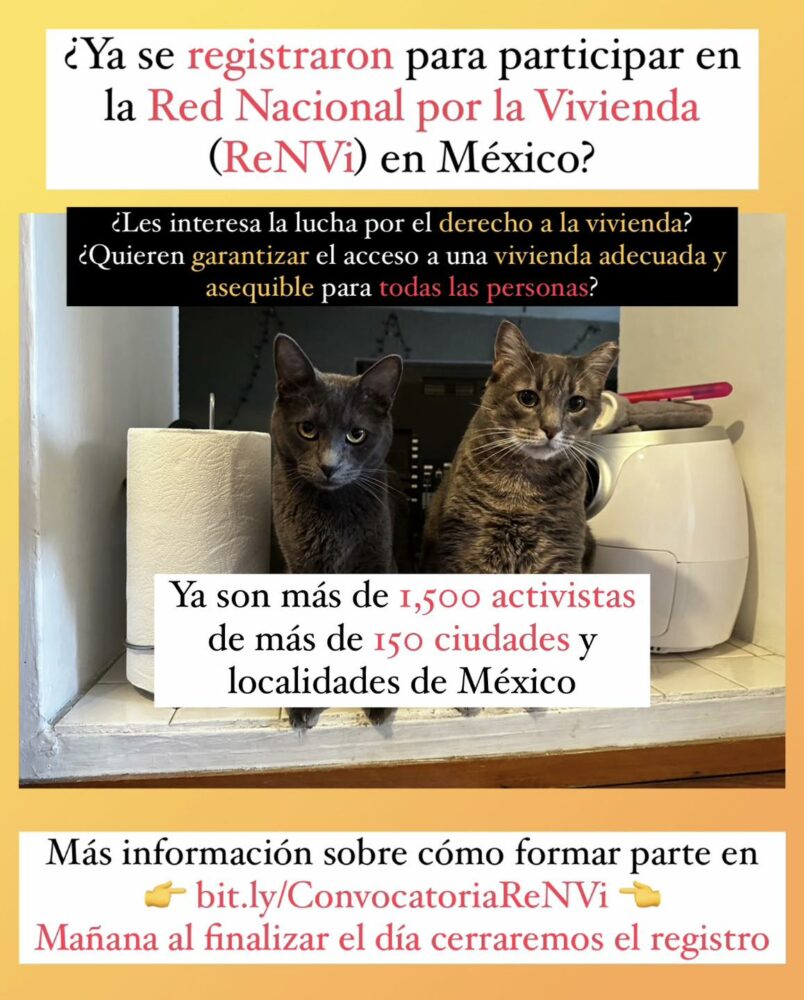 Por el momento, las actualizaciones sobre esta Red Nacional por la Vivienda se difundirán en las redes sociales de Gatitos Contra la Desigualdad.
