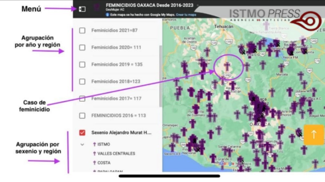Quienes visiten el mapa de violencia feminicida, además de conocer los feminicidios ocurridos en lo que va del sexenio del morenista, Salomón Jara Cruz, también podrán conocer las muertes violentas de las mujeres durante el gobierno del priista, Alejandro Murat Hinojosa.