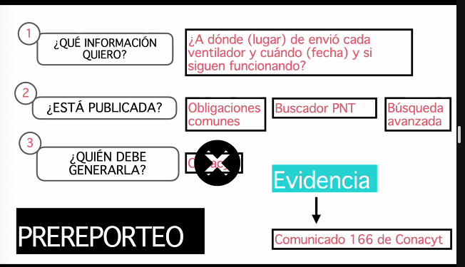 Pero para llegar a esta hipótesis se requiere que les periodistas tengan un trabajo de prereporteo; es decir, que tengan una exploración previa a aquello que se quiere conocer, pues eso ayudará a identificar qué información está disponible, lo cual es clave para poder identificar la que necesariamente sólo podemos obtener a través de transparencia.