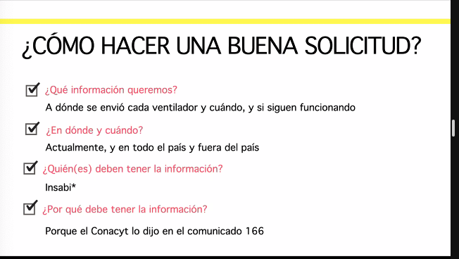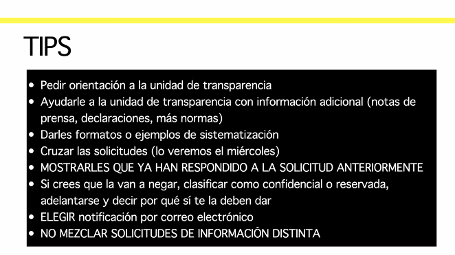 En caso de que aún se tengan dudas sobre cómo elaborar una solicitud de información, el periodista compartió los siguientes tips a les alumnes: