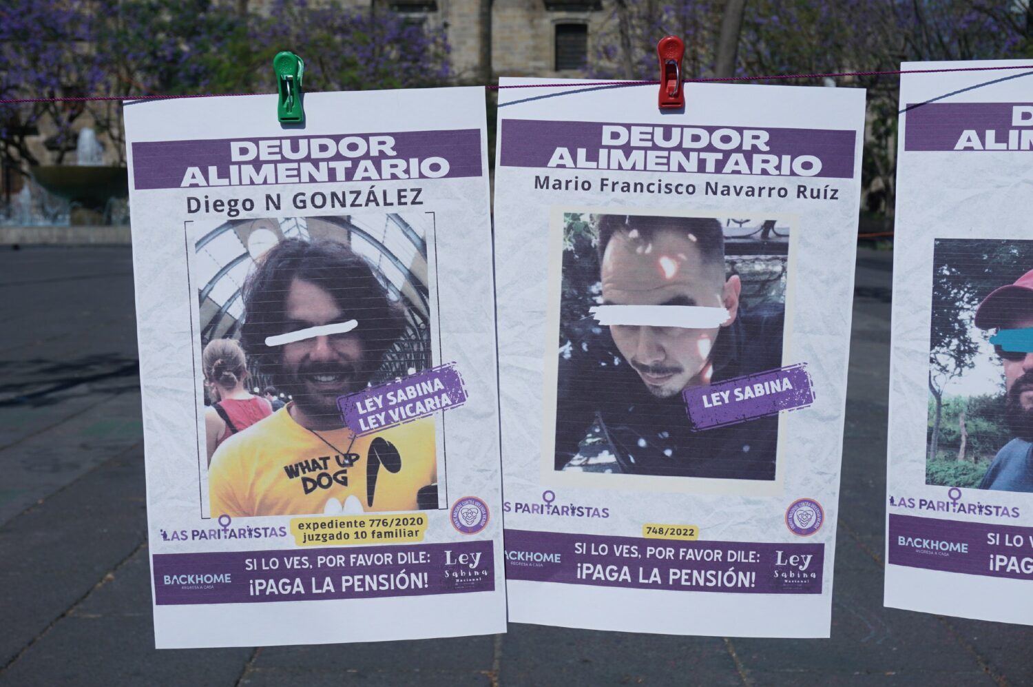 La acción de protesta, reclamo y visibilización incluyó un tendedero de deudores, con el que el Frente Nacional contra la Violencia Vicaria en Jalisco, Las Paritaristas y demás organizaciones solidarias exhibieron los rostros y nombres de quienes también consideran sus agresores y los de sus hijos e hijas, ya que señalaron que el no cumplimiento de sus obligaciones como progenitores atenta contra los derechos de las infancias y adolescencias.