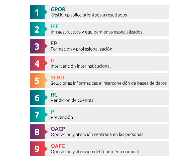 En el documento se enumeran nueve ejes de intervención y la incorporación de dos estrategias transversales en cada línea de acción: la regionalización, con el propósito de establecer un ordenamiento territorial que permita “un proceso de implementación descentralizado y adecuado a las necesidades identificadas”, y la incorporación de herramientas tecnológicas vinculadas al RNPDNO, que incluyen un sistema único de registro de personas desaparecidas, una bitácora de acciones de búsqueda individualizada, expedientes electrónicos y la dispersión de indicios útiles de personas desaparecidas y no localizadas.