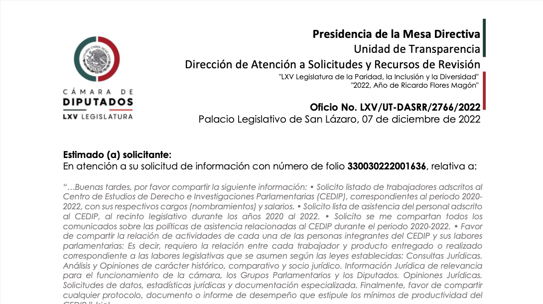 PODER solicitó al Centro de Estudios Parlamentarios, dirección de la Cámara de Diputados del Congreso de la Unión, acceso a todos los estudios solicitados por los y las legisladoras respecto a la aprobación de salario mínimo impulsada por la fracción de Morena. Sin embargo, el director de estudios parlamentarios, Noé Luis Ortíz, se negó a recibir al periodista y mandó a una subordinada (la cual no se presentó con nombre y apellido) a decir que por estatuto interno, no se podían hacer públicos los estudios solicitados por los diputados. También comentó que dicha información no sería entregada vía Plataforma Nacional de Acceso a la Información dado que no están obligados a presentar resultados de sus actividades.