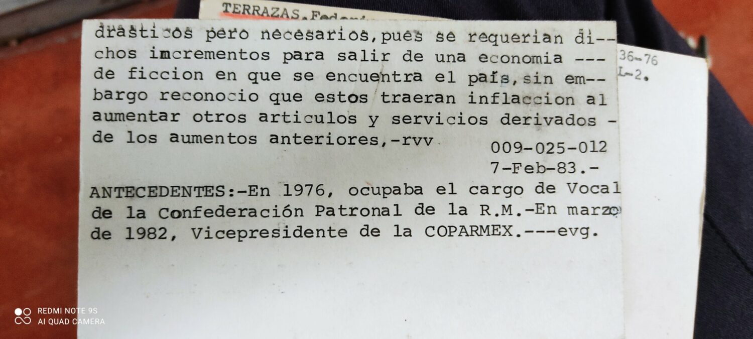 En las fichas elaboradas por el departamento de inteligencia mexicano, se puede leer la postura que Terrazas emitió en su cargo como vicepresidente de la ahora Coparmex, en 1981, respecto al aumento del costo del gas, tortillas, electricidad, pan y gasolina del cual comenta: “Es drástico pero necesario para salir de una economía de ficción”. El objetivo de dicho aumento era el de generar inflación (y reducir el poder adquisitivo del salario).