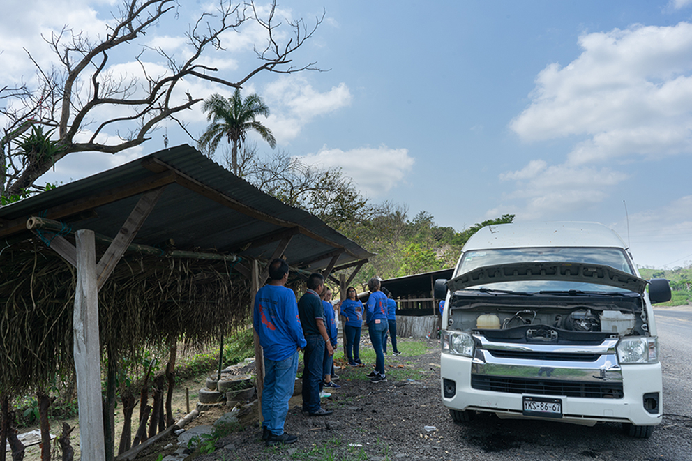 El conductor explica sobre una falla mecánica por lo que se orilla para detenerse. Luego de revisar, avisa que la pieza debe cambiarse y tardará, pero no hay tiempo; debemos llegar al Cereso de Misantla.