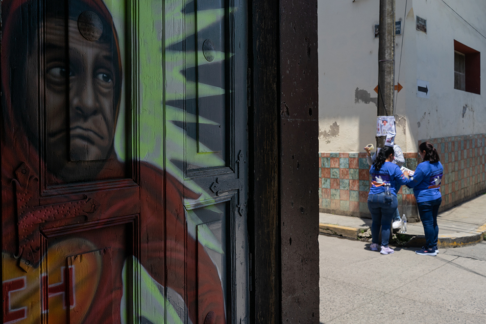 En dos equipos, ayudados por los funcionarios de la CEVB y custodiadas por elementos de la policía estatal, tapizan los postes de las calles empinadas de Papantla.
