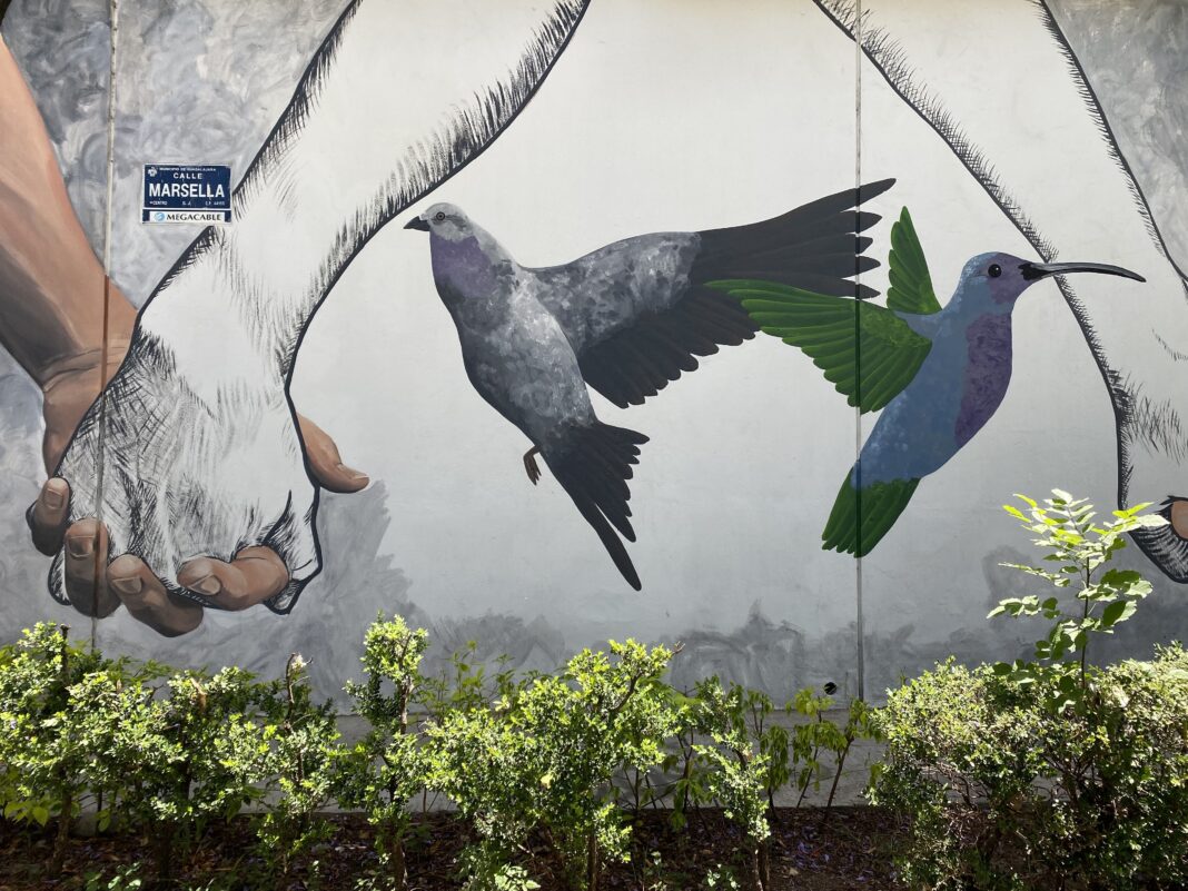 El mural también tiene dos aves pintadas, una de ellos es un colibrí que tiene las alas pintadas de color verde, y la otra es una paloma en tonalidades grises. Acompañando a estas imágenes están también los nombres