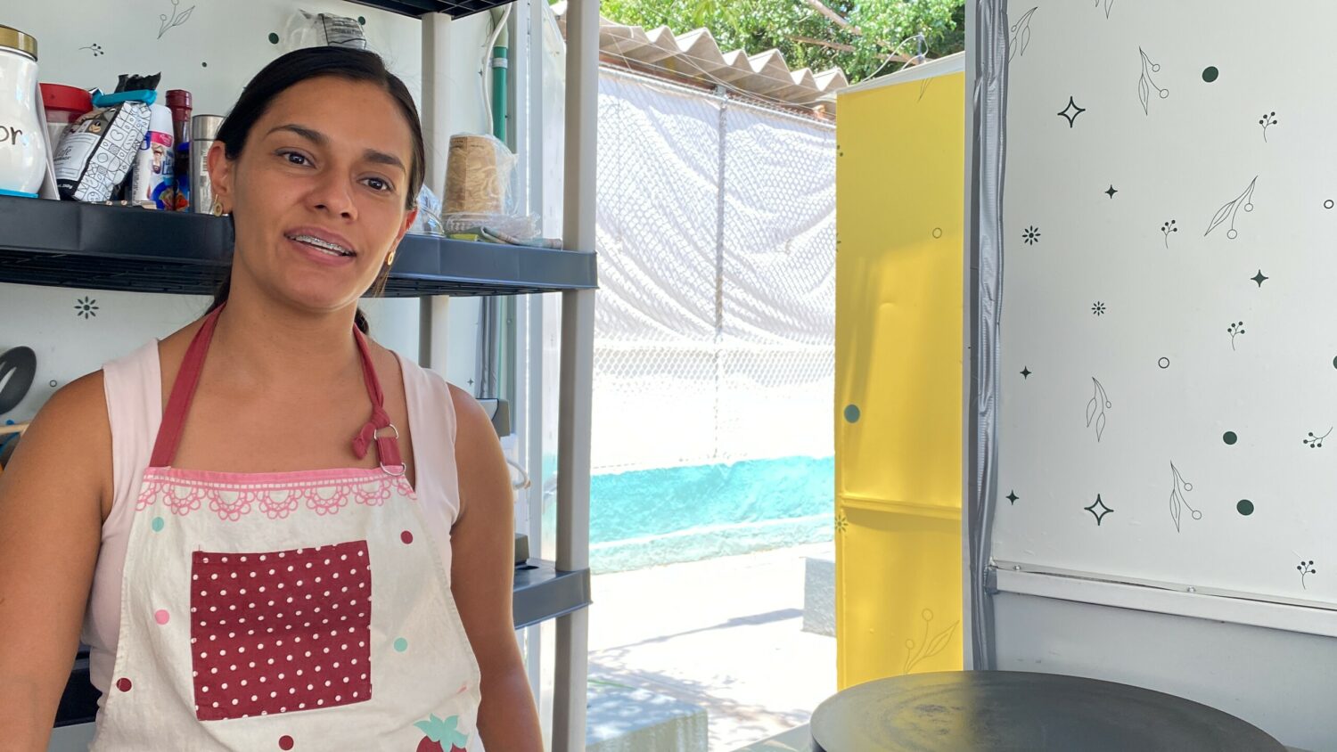 “Estoy yo sola. En la pandemia empezamos a ver qué hacíamos. Mi hijo quien se quedó sin trabajo empezó a hacer tamales y entregas a domicilio. Entonces yo le decía a él que como a mí me gustaban mis gorditas, ‘a lo mejor son del gusto de más gente’. Compré esta planchita y empezamos a vender comida en mi domicilio. Para integrarnos aquí, yo ya tenía una idea de qué iba a hacer. Me gusta hacer guisados, y gracias Dios parece que a otras personas también les han estado gustando”.