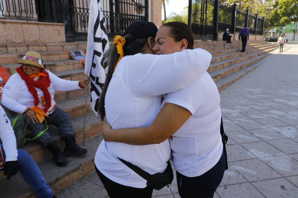 Y cada compañera va y la abraza, la apapacha mientras otras al frente cuelgan lazos entre los postes de luz de la Catedral para colgar bordados que hicieron con la artista y activista Inés Arce, una bordadora de protestas.