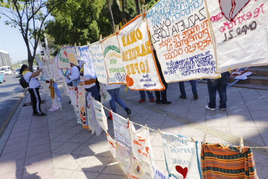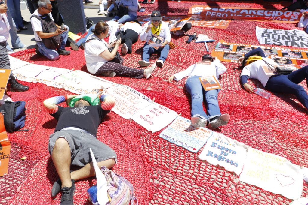 Ahí en la Fiscalía las madres se apostaron sobre un enorme plástico rojo, tejido por ellas mismas, y que representa la sangre y la violencia en Sinaloa. Recostadas sobre el tejido llamado “sangre de mi sangre”, sus propios cuerpos simbolizaban los restos o tesoros que aún no logran encontrar por sí mismas.