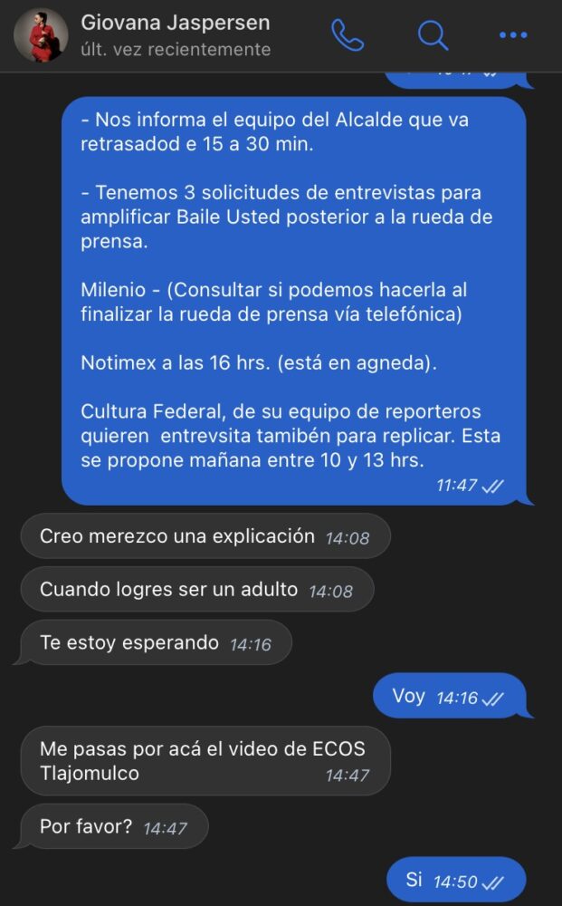 Como no pudimos tomarle fotos con el alcalde, en la entrada del Edificio Arroniz me tomó fuerte del brazo y me dijo: “¿Qué pasó?”. Me quedé helado. “No puedes hablar, cuando puedas hablar subes al despacho”. Y me soltó. Mi estrés y ansiedad era tal que me fui al baño para llorar. Ahí recibí un mensaje que decía: “Merezco una explicación. Cuando logres ser un adulto. Te estoy esperando”. Tomé un tiempo y subí, ya no recuerdo qué me dijo ni cómo me regañó.
