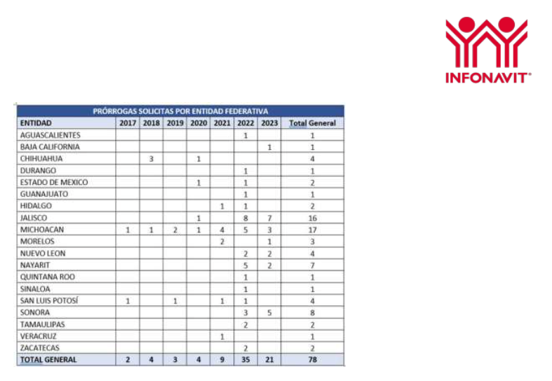 De estas 78 prórrogas vigentes en INFONAVIT, 13 están en proceso de renovación. En cuanto a las que con anterioridad ya han sido renovadas, INFONAVIT precisó que: