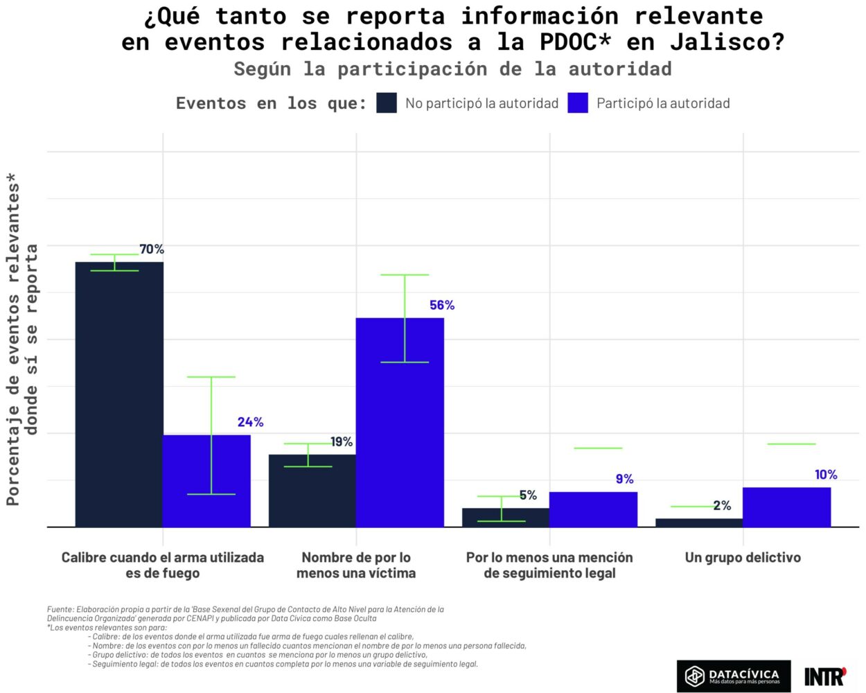 En Jalisco, la calidad de registro es peor cuando participa la autoridad en cuanto al calibre, estadística- mente similar en el seguimiento legal, mejor en los nombres de las víctimas cuando hay algún asesinato y estadísticamente similar en cuanto a los grupos delictivos reportados en el evento.