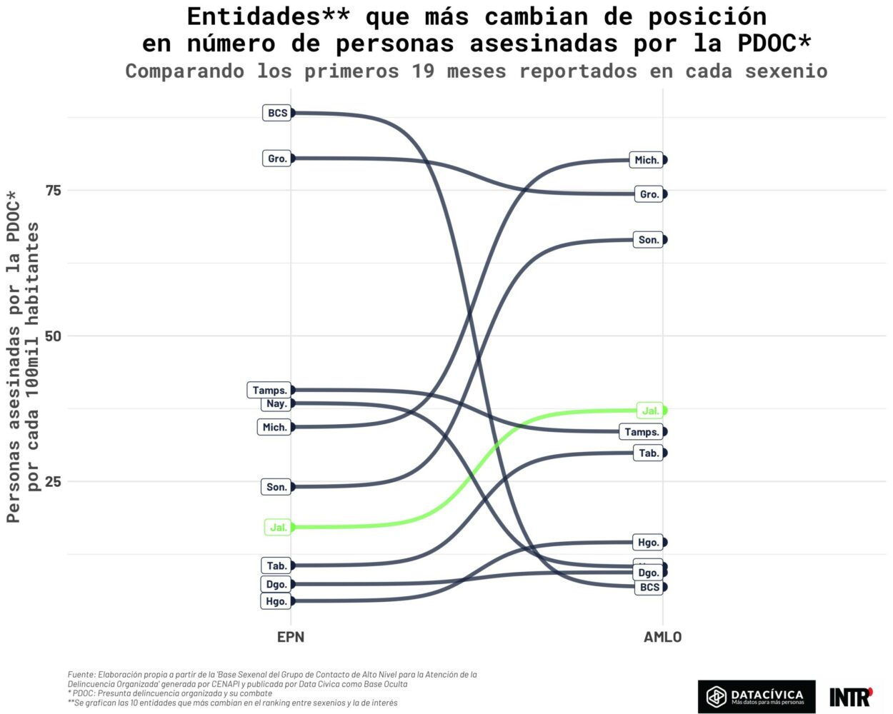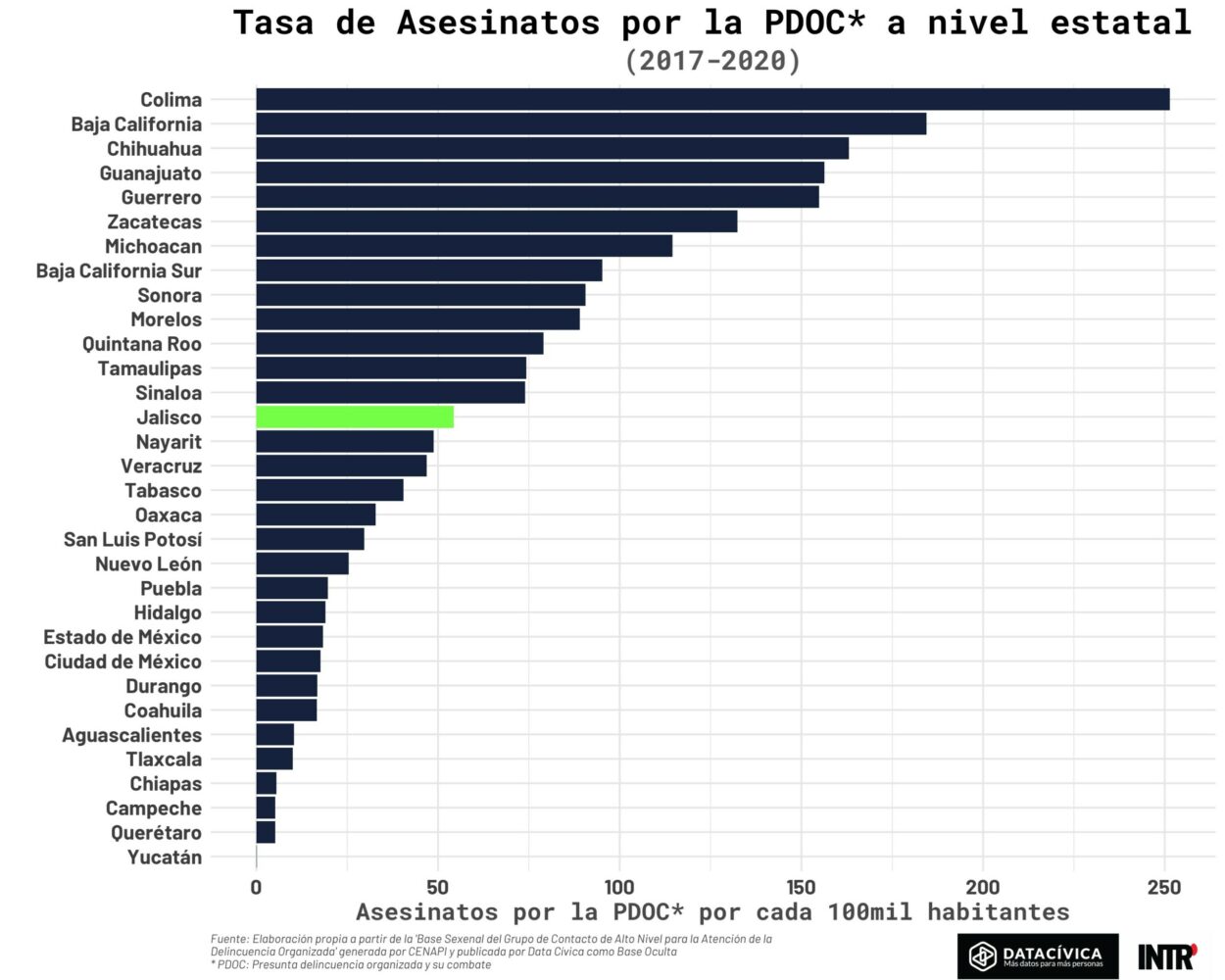 Según la Base oculta, en Jalisco fueron asesinadas 4536 por la presunta delincuencia organizada y su combate entre el 2017 y el 2020. Esto implica que Jalisco es la entidad número 14 con más personas asesinadas por cada 100 mil habitantes bajo ese concepto.