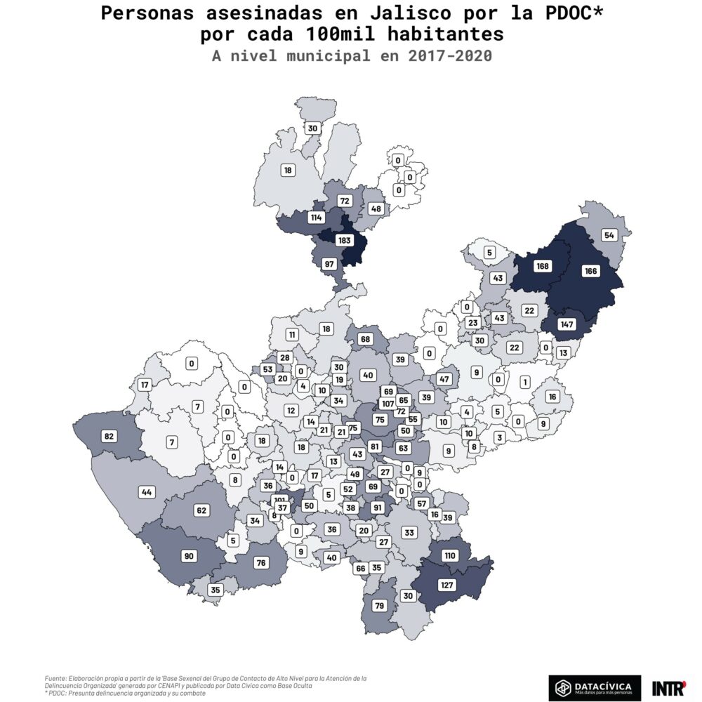 Sin embargo, el reporte de personas fallecidas por la presunta delincuencia organizada y su combate no es similar para todos los municipios en Jalisco. Los municipios con más personas fallecidas por la presunta delincuencia y su combate por habitante entre 2017 y 2020 fueron: Chimaltitán (183.5), Encarnación de Díaz (167.8) y Lagos de Moreno (165.9).