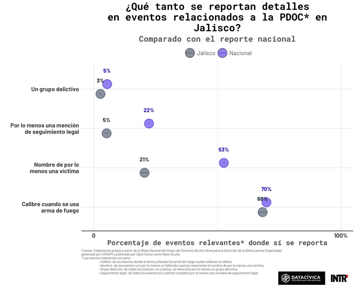 Observamos que en Jalisco la calidad de registro es estadísticamente similar que a nivel nacional en cuanto al calibre, peor en el seguimiento legal, peor en los nombres de las víctimas cuando hay algún asesinato y peor en cuanto a los grupos delictivos reportados en el evento.
