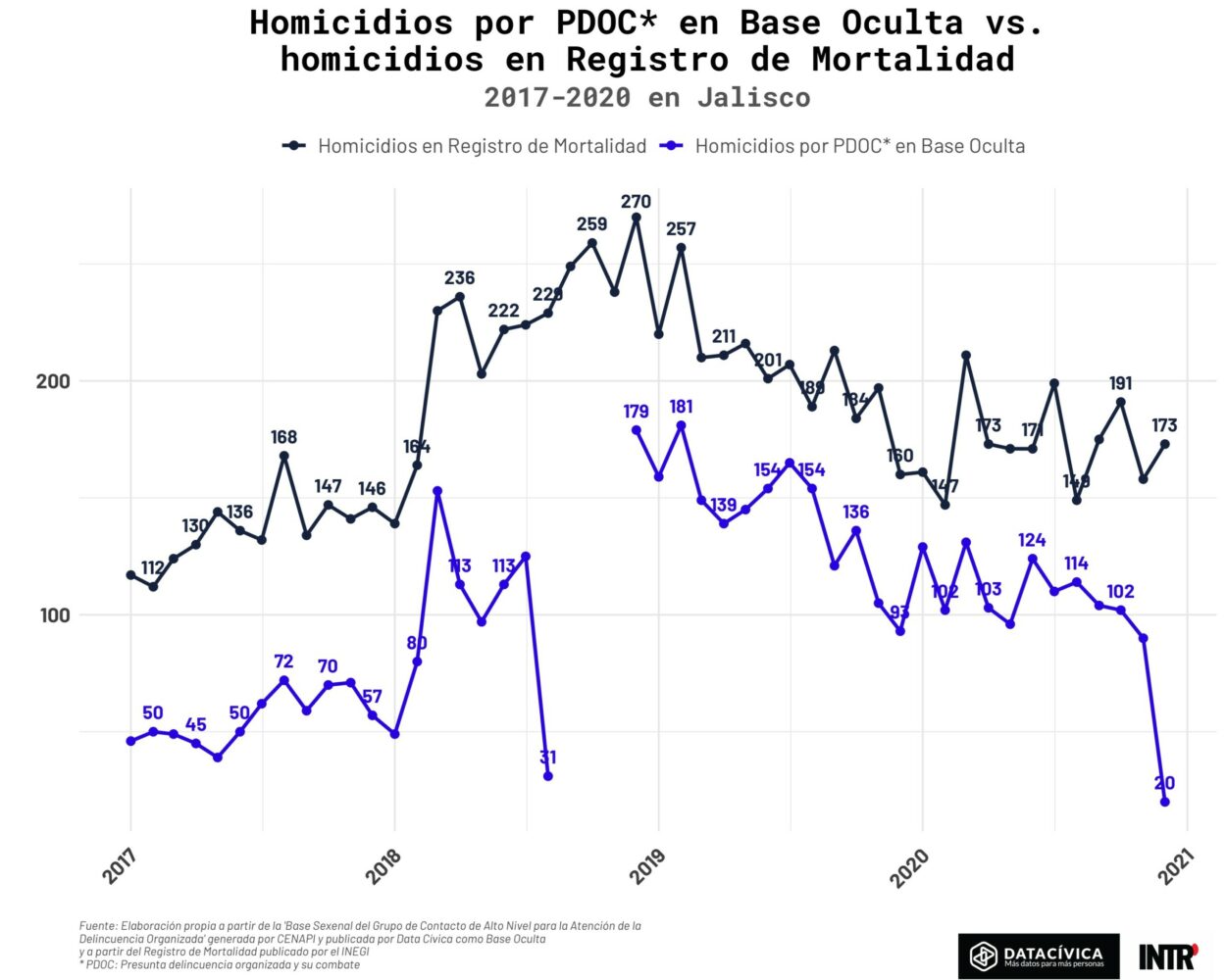 Entre 2017 y 2020 fueron asesinadas 130,583 personas en todo México. Según el Estado, 70,898, la mayoría de ellas (54.2%), fallecieron como consecuencia de la presunta delincuencia organizada y su combate. Para Jalisco el porcentaje de personas asesinadas atribuibles a la presunta delincuencia organizada y su combate es menor. Según la base oculta, 51.3% de las personas asesinadas en la entidad entre 2017 y 2020 fueron asesinadas por la presunta delincuencia organizada y su combate.