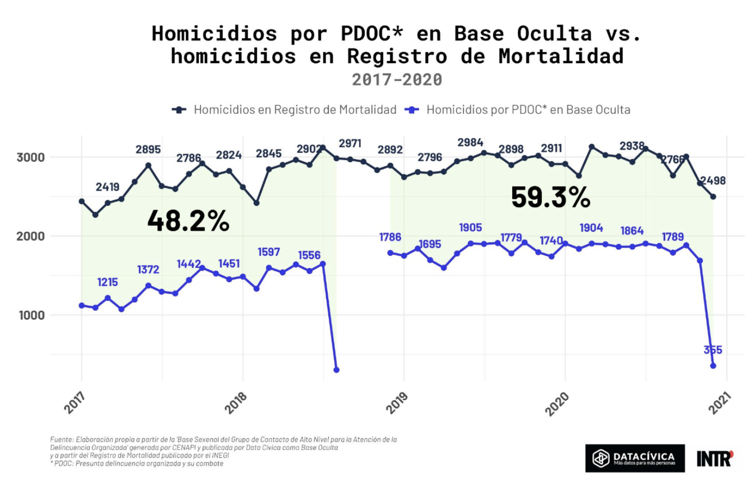 De hecho, el gobierno actual registró bajo esta dudosa clasificación al 59.3% del total de asesinatos ocurridos en todo el país. Un porcentaje mayor que con su antecesor, Enrique Peña Nieto, cuando se atribuyó al crimen organizado o su combate el 48.25% de los homicidios. Una asociación al crimen también mayor al 52% que había registrado el gobierno de Calderón, que en su momento hizo pública una primera base de datos sobre estos hechos.