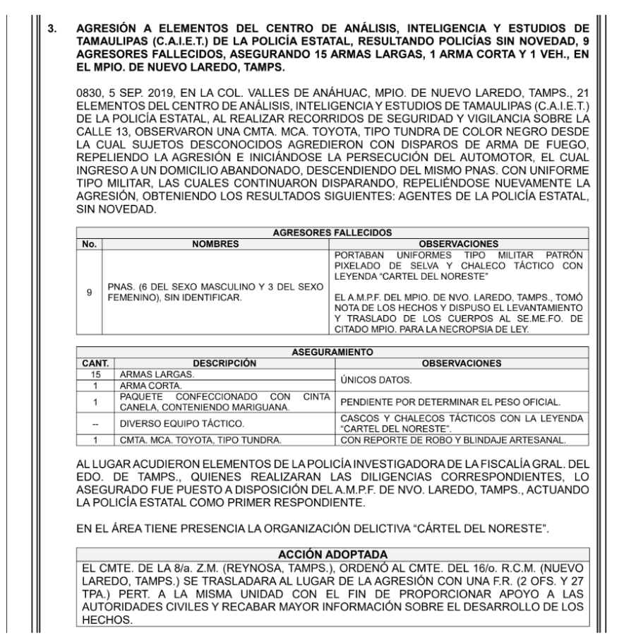 Como cada mañana, el viernes 6 de septiembre de 2019, a las 4:03 horas, el general Luis Cresencio Sandoval, secretario de la Defensa Nacional del gobierno mexicano, recibió en su correo electrónico oficial un archivo adjunto titulado “Resumen de eventos relevantes” del día anterior. Ahí le informaban, entre varios casos, sobre una “agresión” a policías en Nuevo Laredo, Tamaulipas, luego de la cual, a la zona acudieron militares de la 16 Región Militar, para “apoyar” a las autoridades civiles, siguiendo los protocolos de rutina.