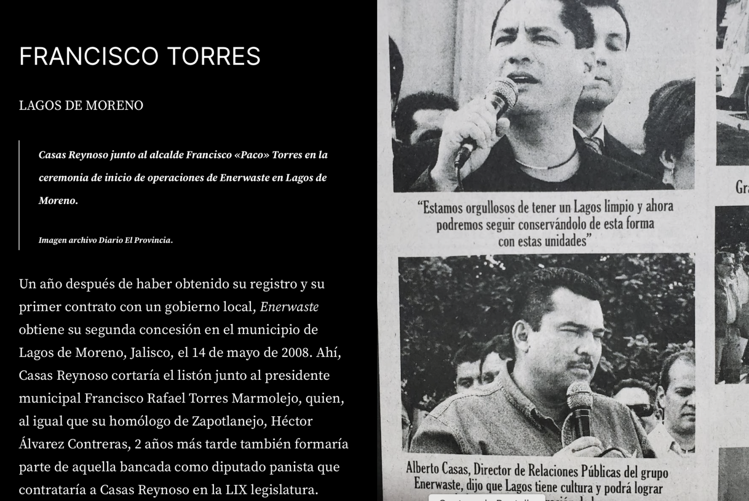 La gran paradoja es que este relleno sanitario, incendiado en múltiples ocasiones y rodeado de malos manejos, ha sido uno de los negocios promovidos por un político que cultivó su carrera como defensor del medio ambiente. José Alberto Casas Reynoso fue en su momento director general de la empresa Enerwaste, concesionada a cargo del vertedero de Lagos de Moreno desde el año 2008. Además, su esposa Josefina Jiménez López es uno de las cuatro propietarios de la compañía.