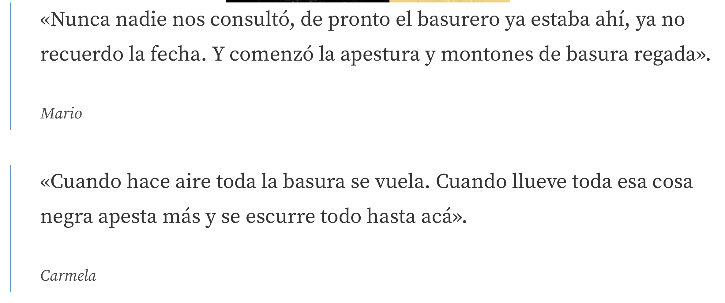 Cada mañana se levanta sin saber que el dueño de la empresa operadora de aquellas montañas de basura frente a su casa es un político ambientalista, el cual, alguna vez confesó haber experimentado con el uso de lixiviados en los campos cercanos a los vertederos que controlaban.