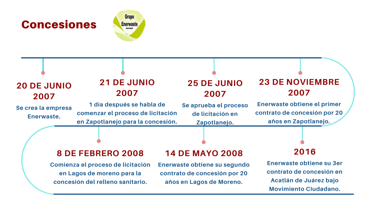 Enerwaste fue creada el 20 de Junio del año 2007, 1 día después se presenta en el cabildo de Zapotlanejo el dictamen para aprobar un proceso de licitación para concesionar el servicio de basura; 5 meses después de ser creada la empresa se le da una concesión de manera directa en Zapotlanejo por 20 años.