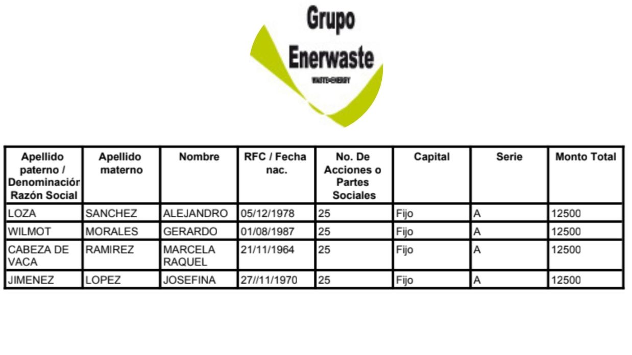 La empresa Enerwaste fue creada el 20 de junio de 2007 en Zapopan Jalisco teniendo como socios a 4 personas: Alejandro Loza Sánchez, Marcela Raquel Cabeza De Vaca Ramírez, Gerardo Wilmot Morales y Josefina Jiménez López.