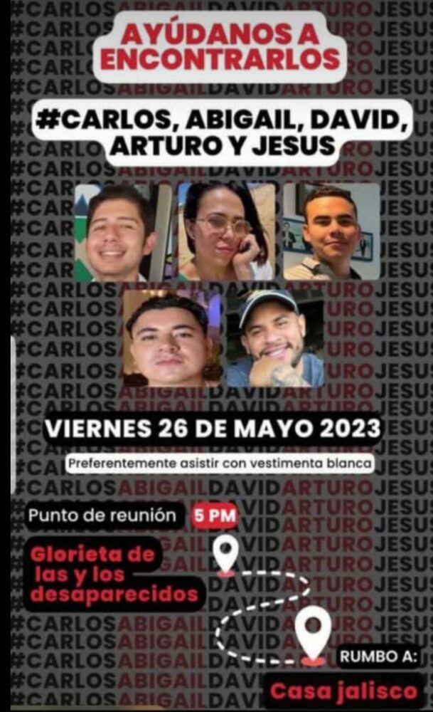 Benjamín, Carlos, David, Itzel, Arturo y Jesús Alfredo fueron desaparecidos en Zapopan; el primero, el 20 de mayo en Paseos del Sol, mientras que los cuatro jóvenes se les dejó de ver cuando acudieron a laborar en un call center en la colonia Jardines Vallarta, el 22 de mayo.