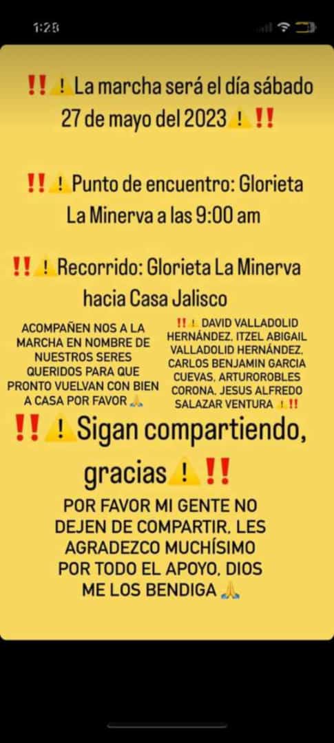 Por la desaparición de los jóvenes trabajadores del Call Center y la de Carlos Benjamín García Cuevas -quien fue desaparecido el 20 de mayo en la colonia Paseos del Sol en Zapopan- familiares y amigos están convocando a dos manifestaciones que partirán de la Glorieta de las y los Desaparecidos hacia Casa Jalisco; la primera se realizará este viernes a las 17 horas, mientras que la segunda se llevará a cabo el sábado 27 de mayo a las 9:00 horas.