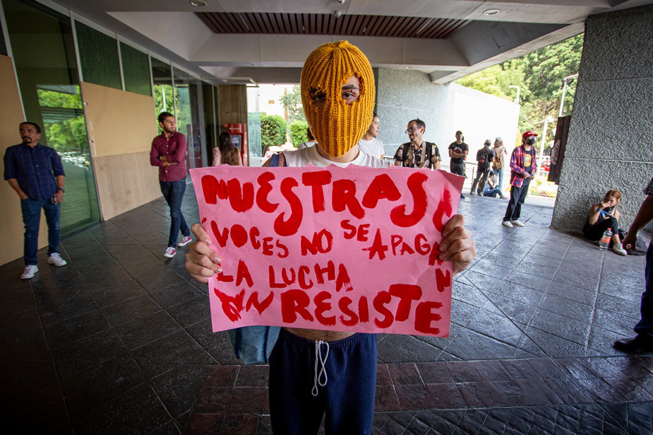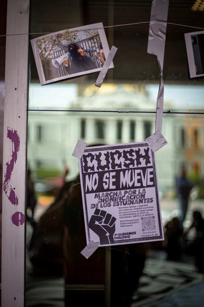 Portando pancartas con mensajes como: “La Universidad es de lxs estudiantes” y “El CUCSH no se mueve“, las y los estudiantes se mantuvieron por casi dos horas en la entrada principal de la Rectoría, la cual fue resguardada por trabajadores que formaron una valla humana para impedir el acceso.