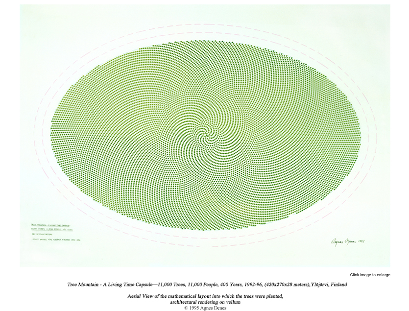 A propósito del cambio climático, artistas e instituciones de todo el mundo se han ocupado y preocupado por atender este asunto tan alarmante. Uno de los que me parecen más impresionantes es la obra “Montaña de árboles” de la artista y activista Agnes Denes, en donde se plantaron once mil árboles en colaboración con el gobierno de Finlandia y miles de patrocinadores.