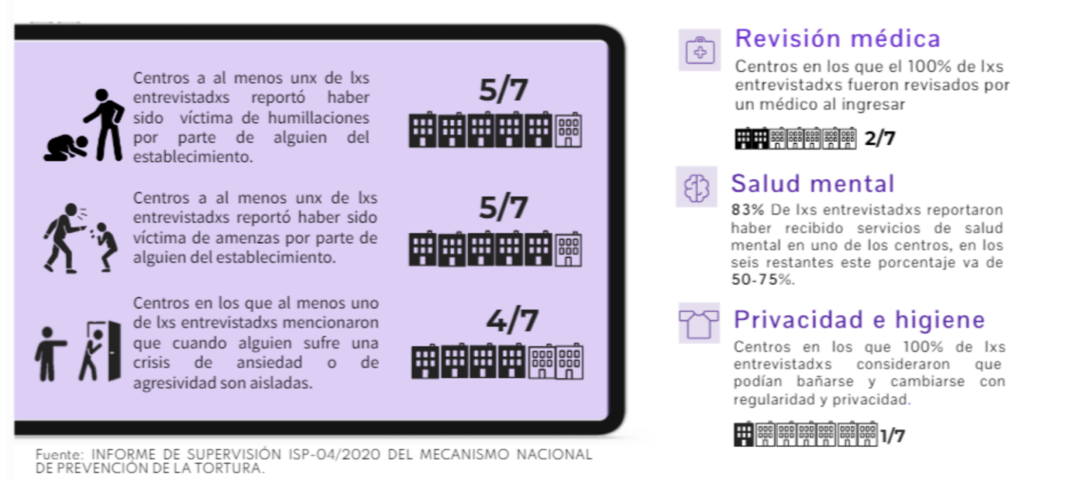 ¿Qué encontró la CNDH en los establecimientos estudiados? Encontró que en el rubro de “Protección contra la tortura y otros tratos o penas crueles, inhumanos o degradante”: cinco de siete centros analizados aplican algún tipo de sanción o castigo, así como amenazas. Sumado a ello, otra técnica es el aislamiento prolongado.