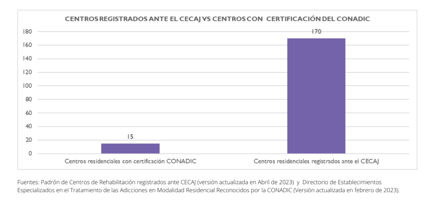Los 170 establecimientos restantes tienen únicamente el reconocimiento del CECAJ; sin embargo, la ley les obliga a tener ambos avales institucionales, pese a ello operan debido a la alta demanda que tienen para la atención de personas con algún problema de adicción.