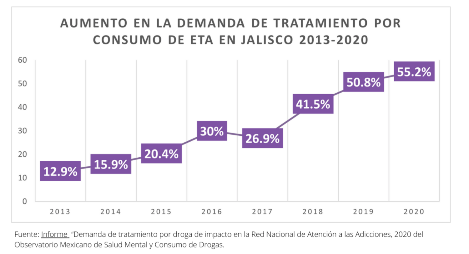 El posicionamiento de los Estimulantes de Tipo Anfetamínico (ETA), trae consigo una serie de problemas sociales, económicos y sobre todo de salud pública que se reflejan en un aumento considerable de la demanda de atención especializada debido al ETA, pues su consumo pasó de representar el 12.9% en 2013 al 55.2% en 2020, según datos sistematizados por el Observatorio Mexicano de Consumo de Drogas y Salud Mental.