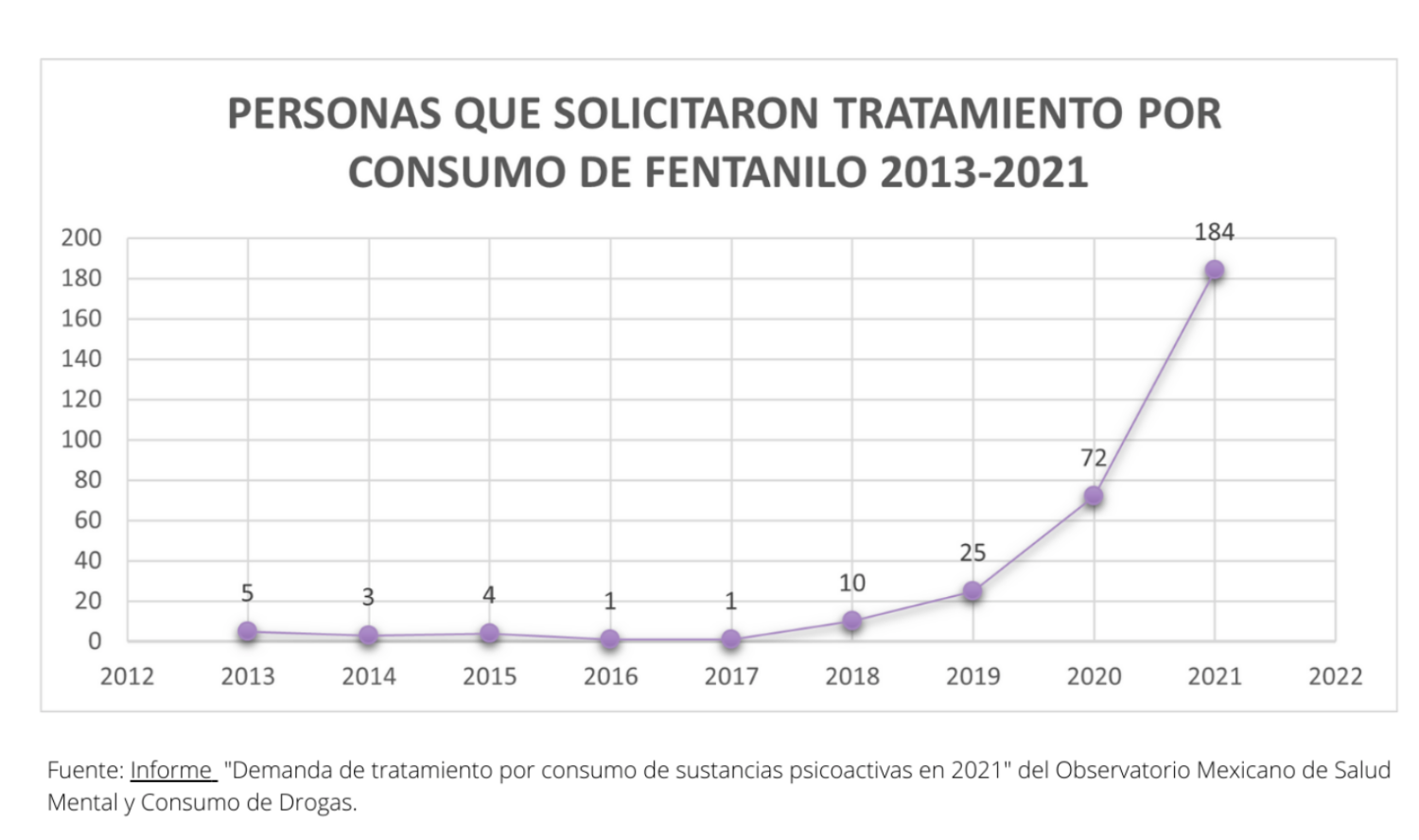 Pese a ello, vale la pena aclarar que en el caso del fentanilo, la heroína y otras drogas sintéticas no presentaron un alto nivel de demanda de rehabilitación en las encuestas nacionales sobre la materia, esto porque de acuerdo a un estudio sobre la caracterización de servicios de rehabilitación realizado por la CONADIC: “los consumidores de este tipo de sustancias no viven habitualmente en un hogar formalmente establecido y no necesariamente acuden o reciben tratamiento”, a pesar de eso si se ha reportado un aumento en la demanda de tratamiento por uso de estas nuevas drogas.