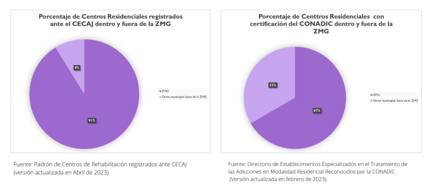 La brecha de género en la oferta de servicio es muy pronunciada tanto en la modalidad residencial como ambulatoria. Según datos del CECAJ (2022), en el estado sólo hay 15 centros de rehabilitación residenciales reconocidos por la CONADIC, y sólo dos de ellos son femeniles, dicha diferencia no es algo propio del estado de Jalisco sino que se repite en otros estados, sobre esto la investigadora Corina Giacomello advierte en uno de sus estudios que: